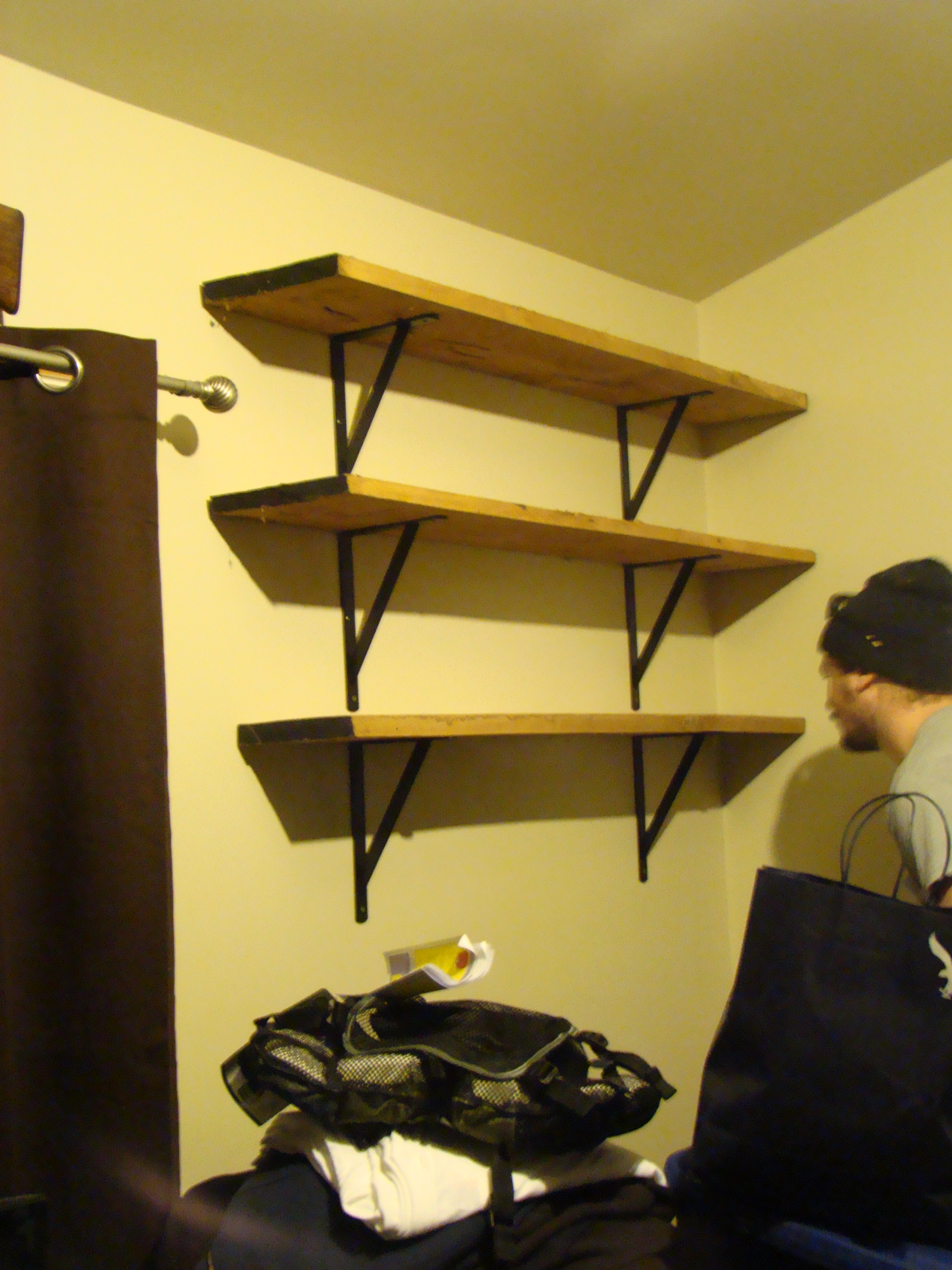 Once we got a little more settled & got our kitchen & bathroom in working order I was able to take a step back and get the smaller things more in order. I realized how much wall space we had. The east wall was mostly windows but the west wall would be perfect for some shelves. We already had a lot of old barn boards so I figured I could just get some shelf brackets and enlist the boyfriend to mount them up for me. So that’s what I did!
