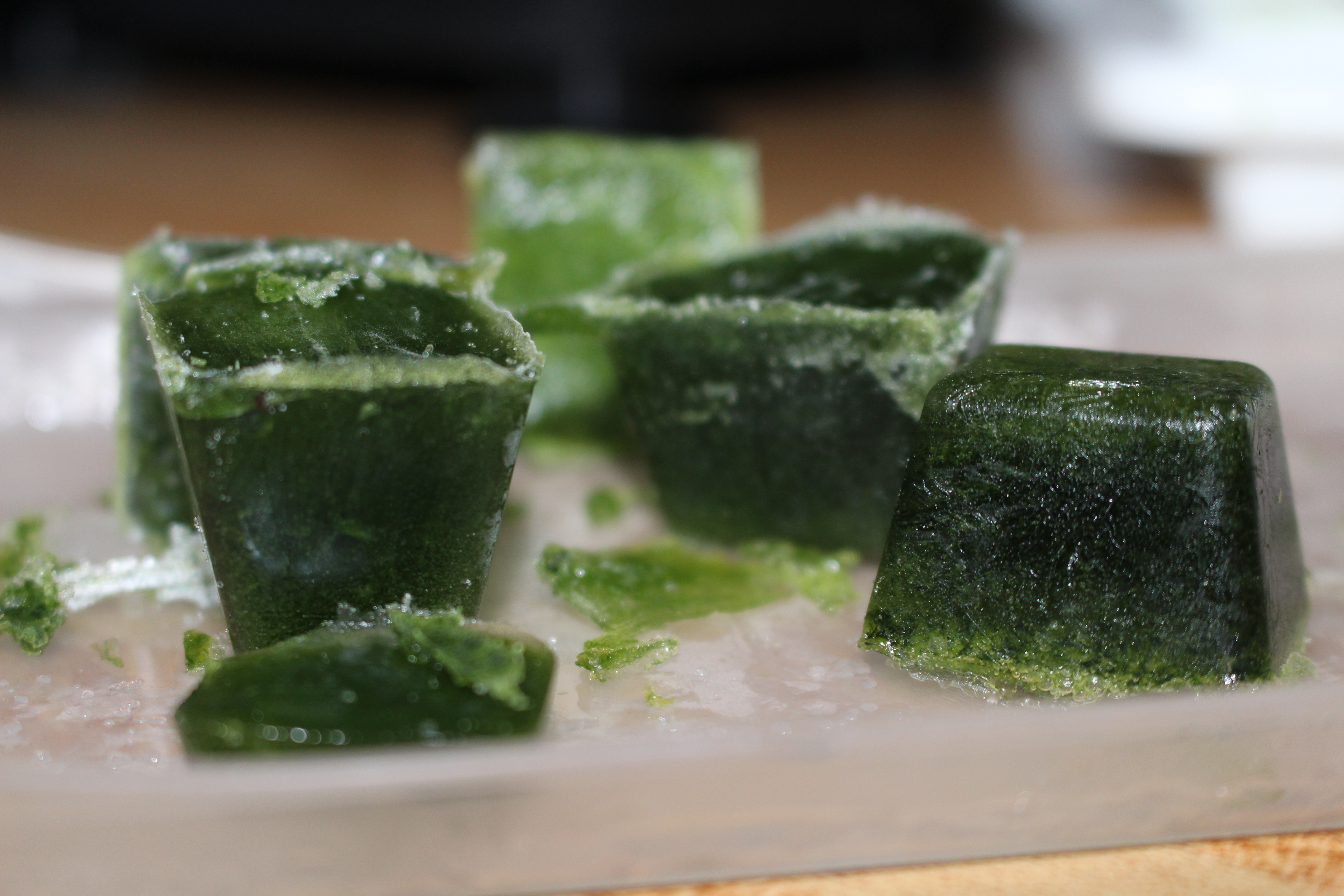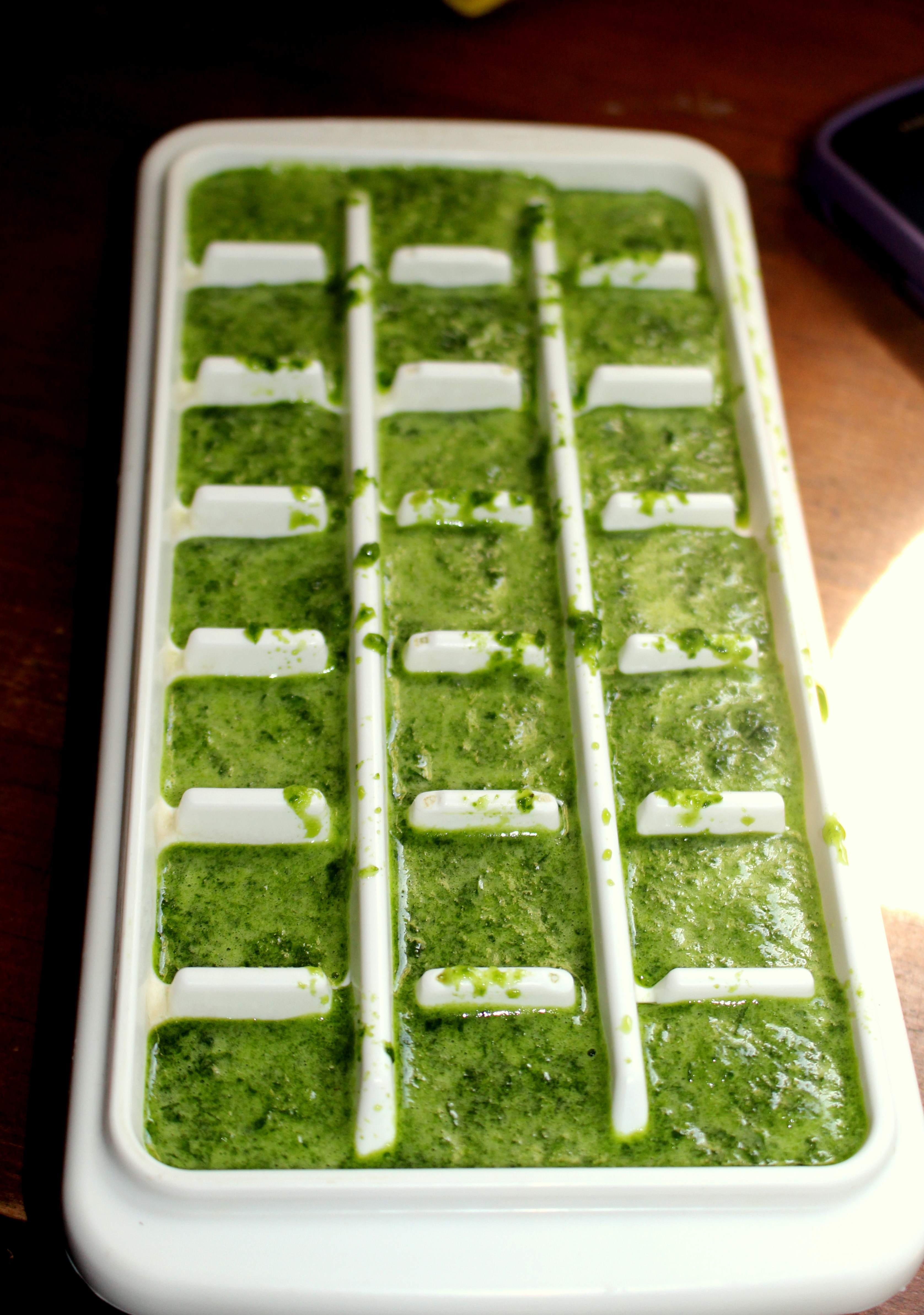 Frozen veggie cubes! Sometimes I leave them in the tray or you can pop them out into a freezer bag. Whatever works! It’s such a great way keep from throwing out your bad greens and you will definitely save some of that other green too!