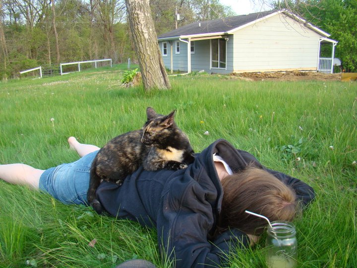 My old kitty, Willow (aka Rocket Monkey), chilling on Hilary’s back after a hard 30 minutes of work.