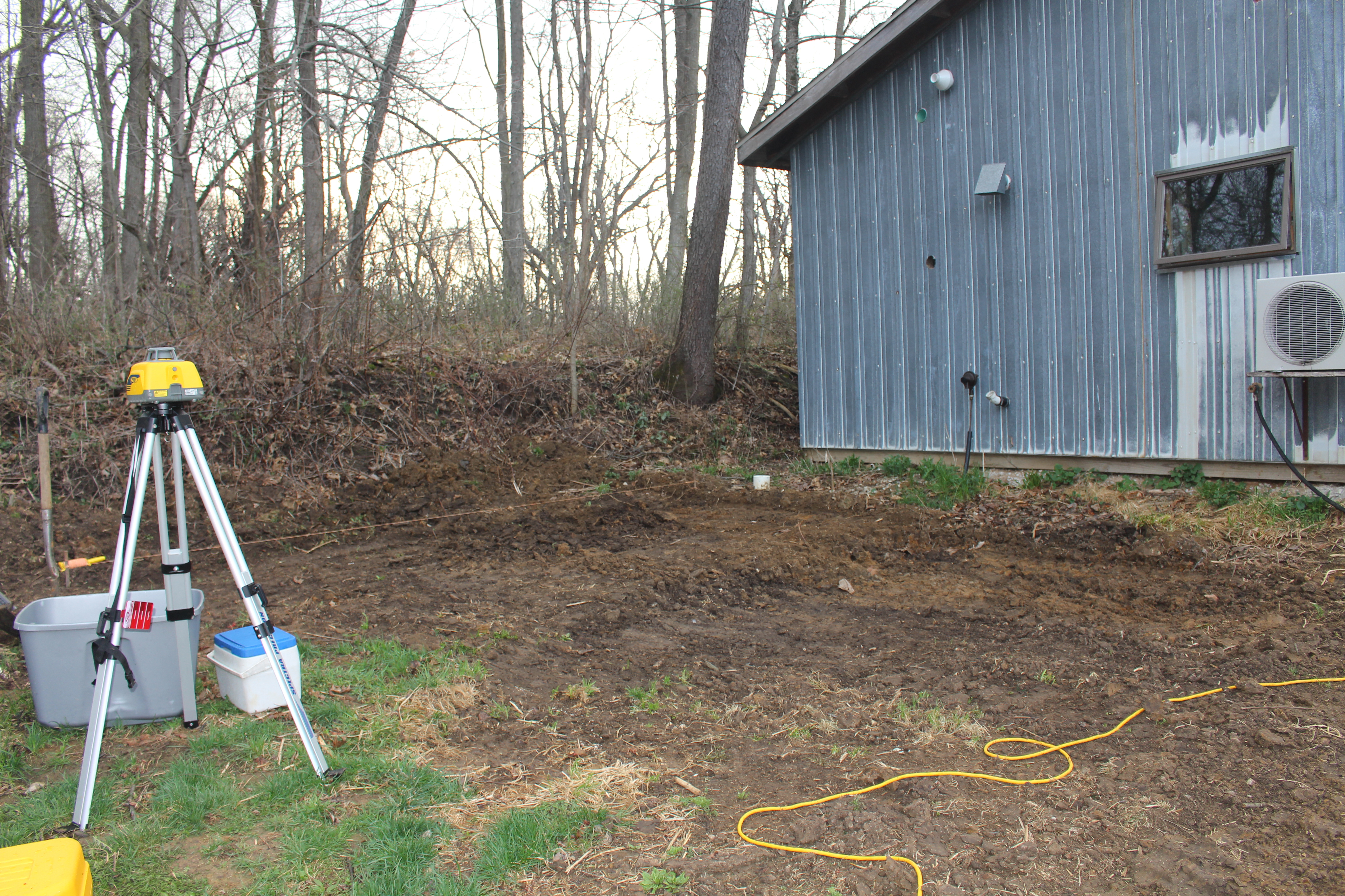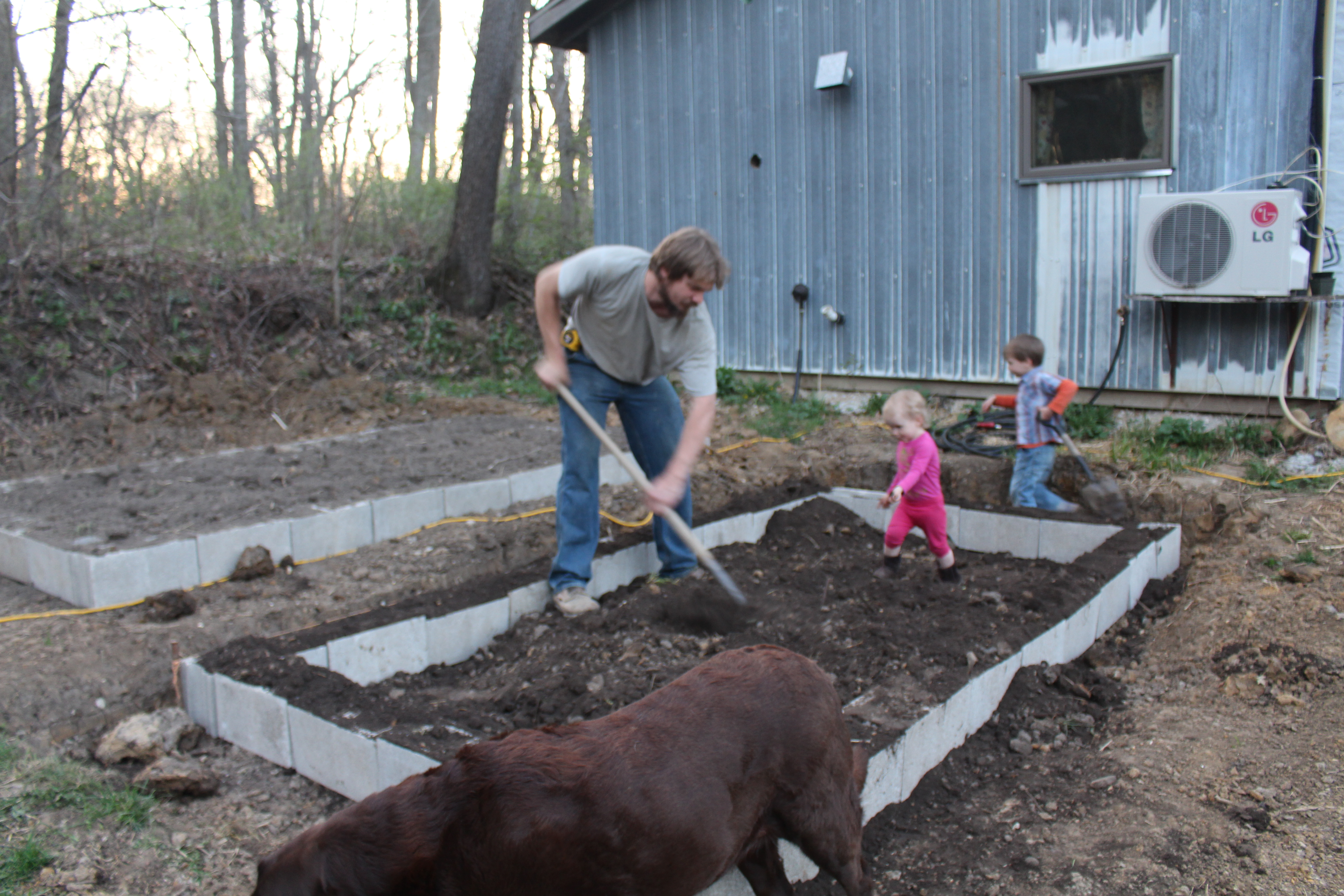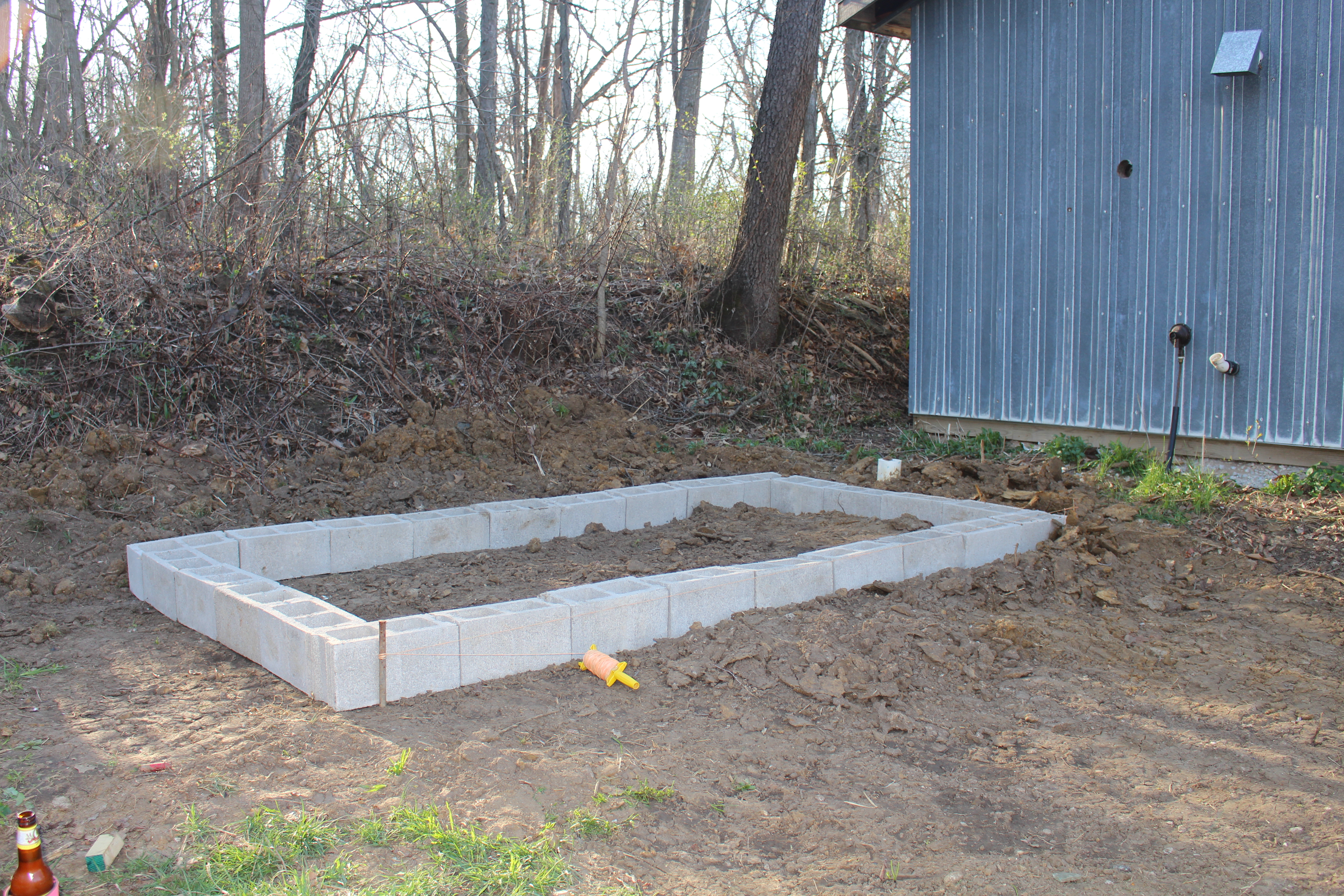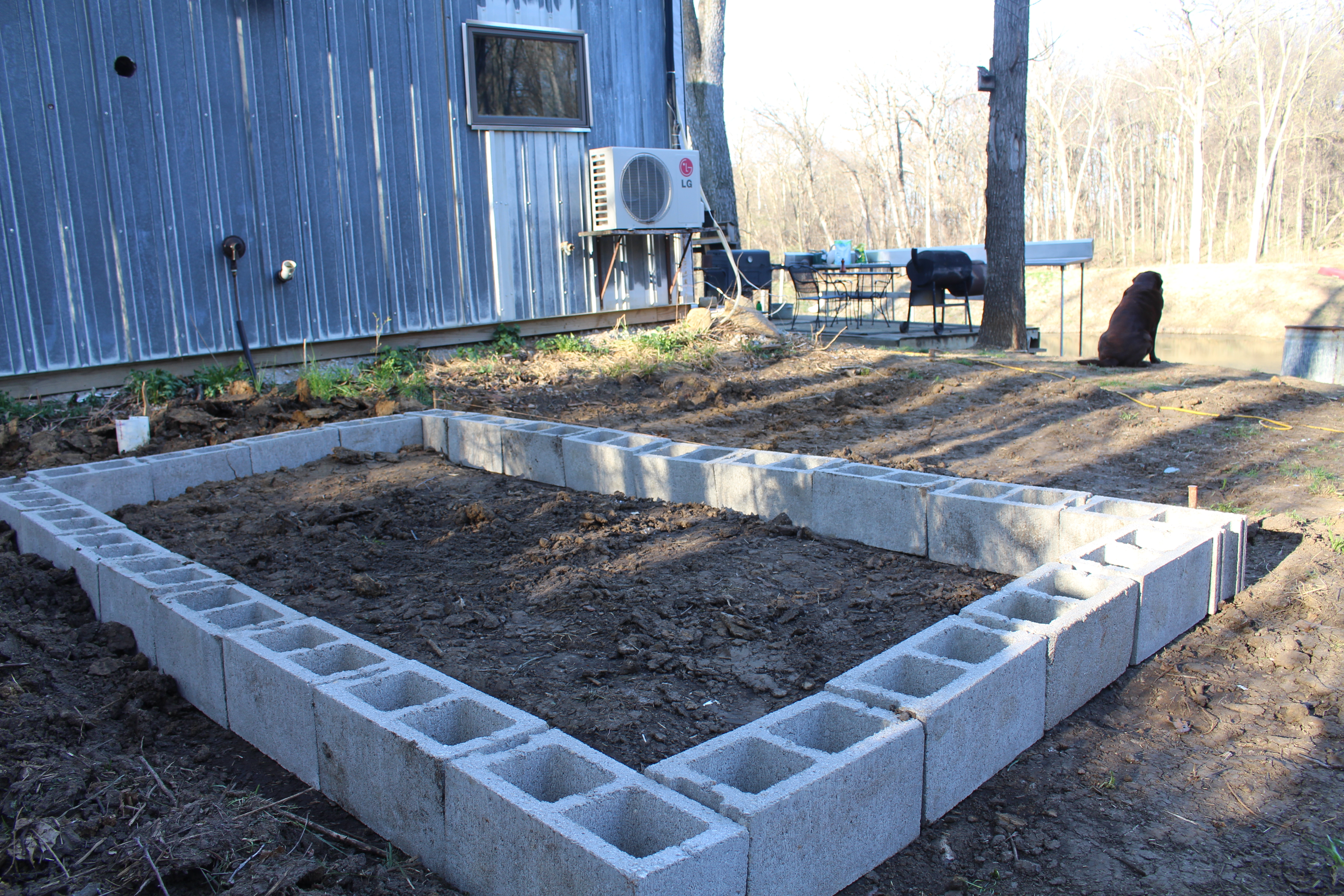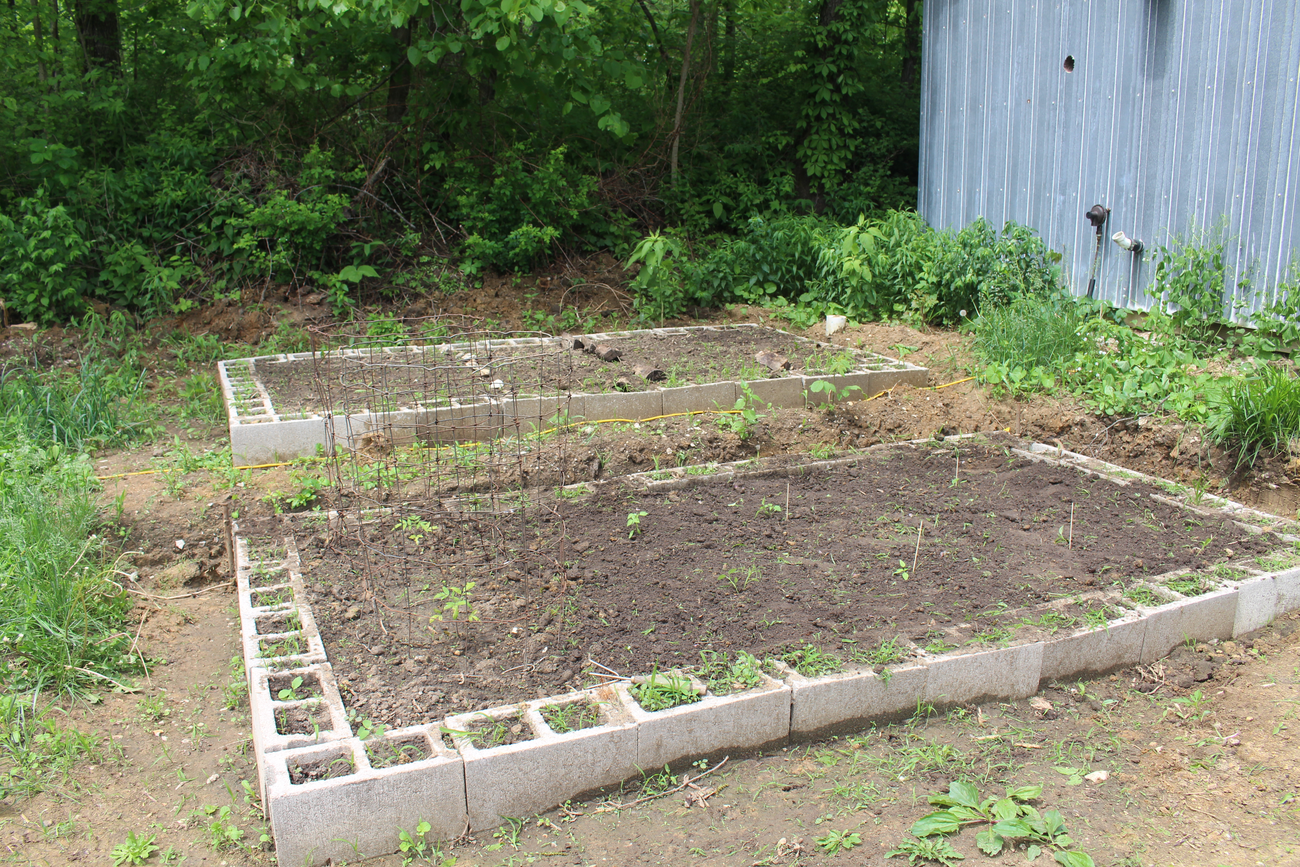 This year we decided to try using concrete blocks to make a couple of raised beds behind the cabin. Here is the spot after Nathan started to level it out.