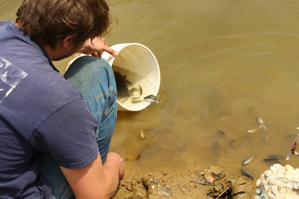 April 2014 – Adding the fish! G-pa Tony came out to see! 🙂