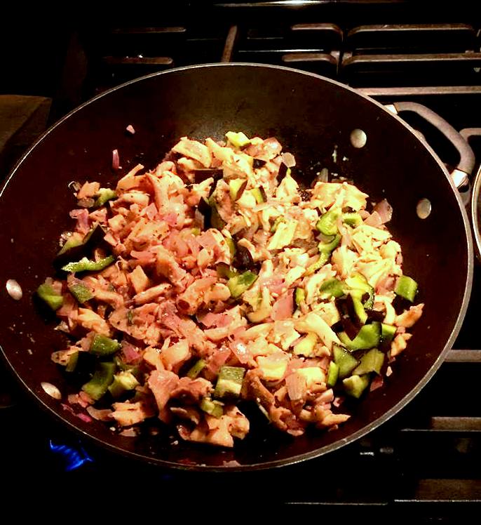 I then chopped some of the Hen of the Woods into smaller pieces and threw them in with the onions. I added a green pepper to the mix too.
