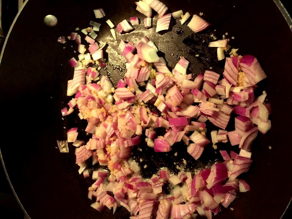 Begin by preheating your oven to 400 degrees (this might vary depending on the type of crust you use). Next, I chopped up a red onion & sautéed it for a few minutes with some butter and garlic.