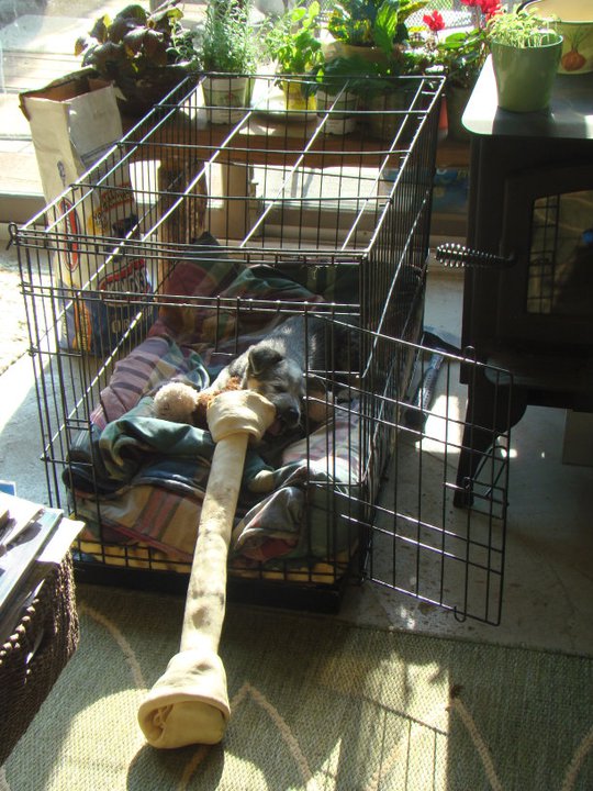 He hid under the table enjoying his snack until later deciding to drag it into his kennel.
