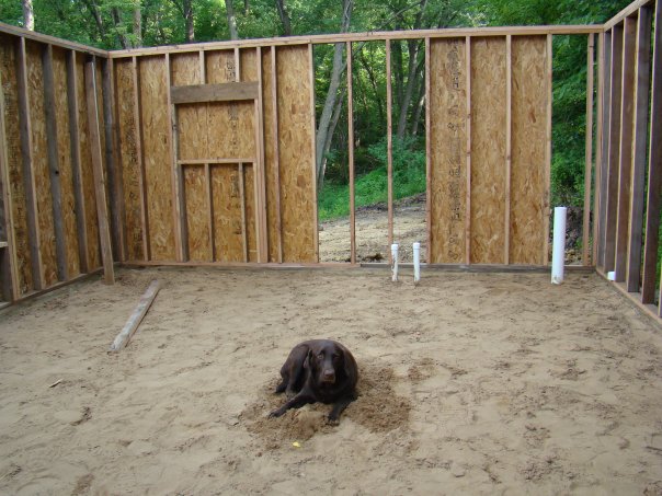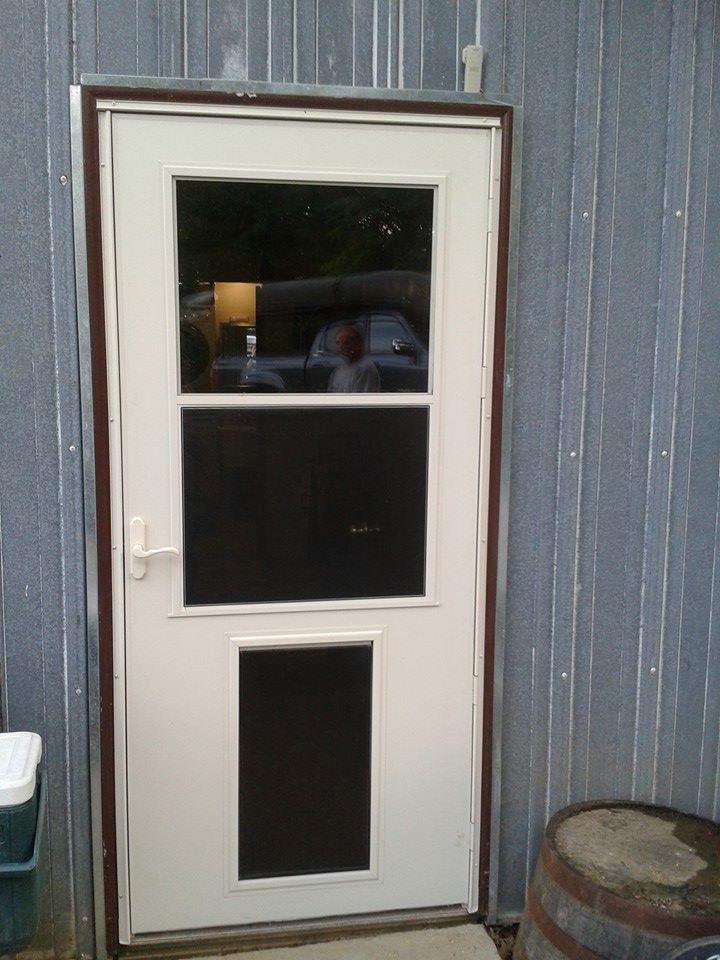 We re-used some tin for the siding. Recycled & free! And of course we had to get a doggie (& cat) door.